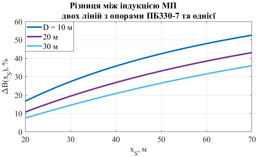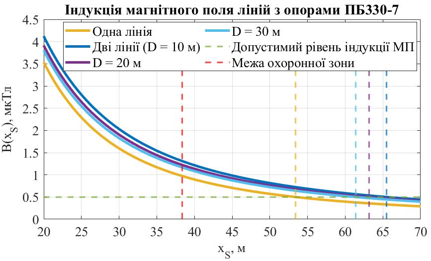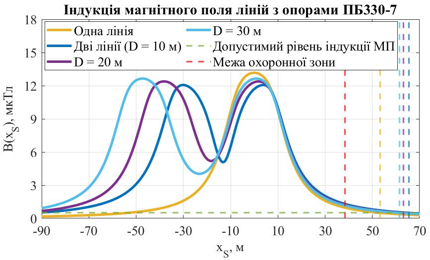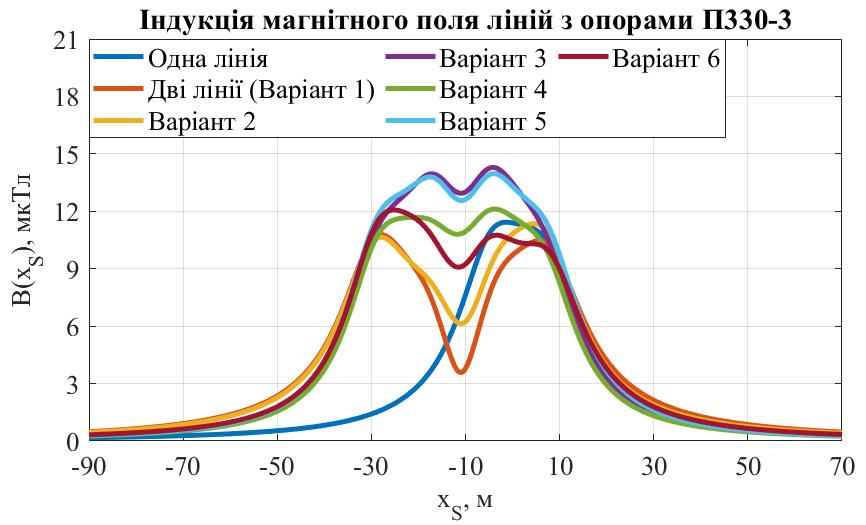 У зв’язку з шкідливим впливом низькочастотного магнітного поля на здоров’я людини актуальною є задача зниження індукції магнітного поля ліній електропередачі поза межами їх охоронних зон. Проведено математичне моделювання магнітного поля ліній електропередачі, що проходять паралельно, на невеликій відстані. Порівняно величину індукції магнітного поля однієї лінії та двох паралельних за різних порядків підвісу фазних проводів. Показано, що за однакового порядку підвісу фаз та однакового напрямку струмів двох ліній спостерігається значне зростання індукції магнітного поля на межі охоронної зони та поза нею, а також збільшується відстань до межі з допустимим рівнем індукції. Визначено, що за певного порядку підвісу фаз можливо досягти значного зменшення величини індукції магнітного поля, і для різних типів опор оптимальними (дають мінімальне значення індукції магнітного поля поза межею охоронної зони) будуть різні варіанти підвісу. Також показано, що за протилежного напрямку струмів ліній найкращим стає однаковий порядок підвісу.