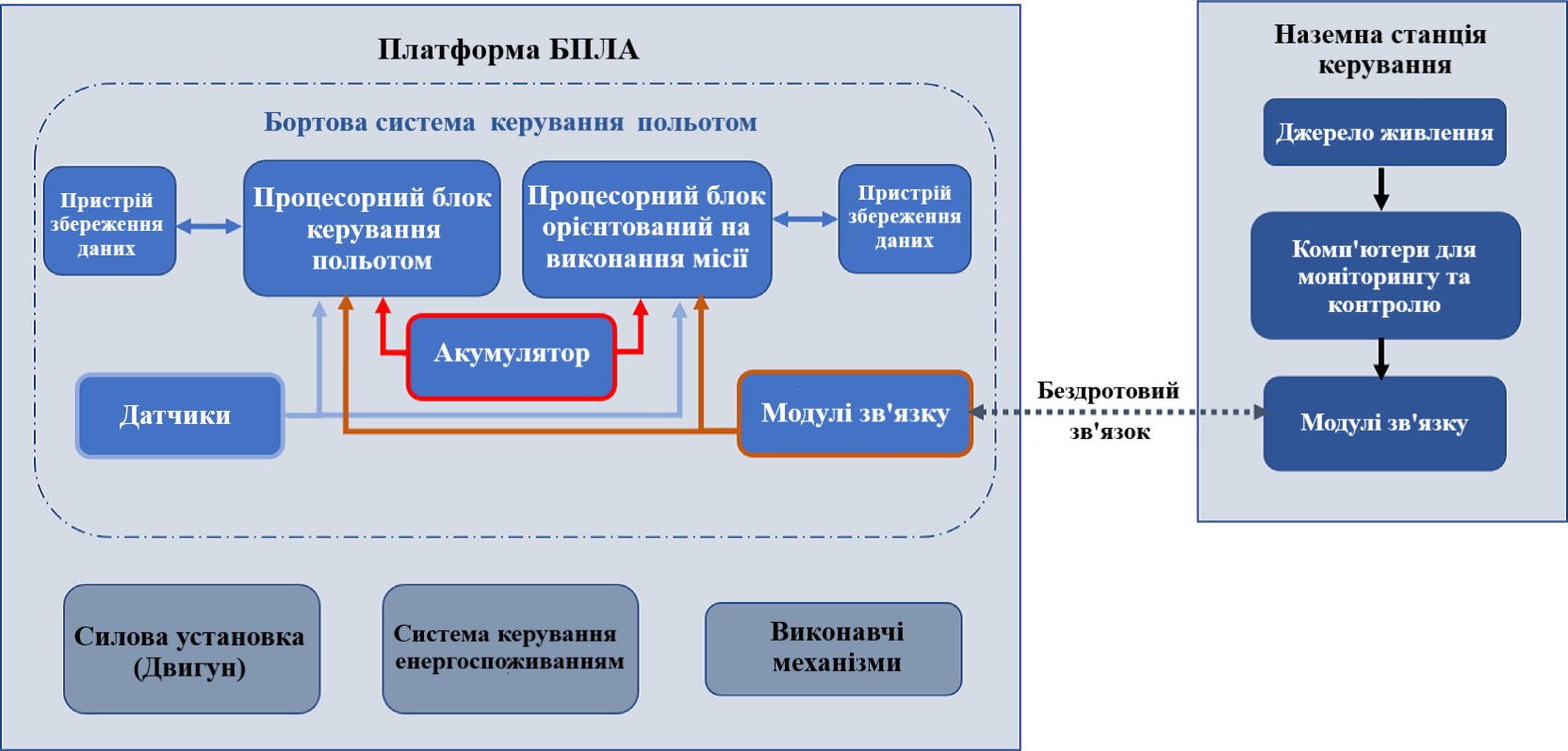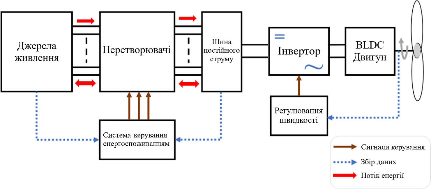 Представлена класифікація дронів – як військових так і цивільних за відповідними критеріями. Показані блок-схеми типового безпілотного літального апарату та його силової системи. Проаналізовано явище виникнення обмінної потужності в системах живлення електротранспорту від джерел постійного струму і конкретно в системі живлення безпілотного літального апарату. Представлена спрощена принципова схема системи живлення двигуна постійного струму. Виведено співвідношення для визначення величини обмінної потужності в системі живлення.