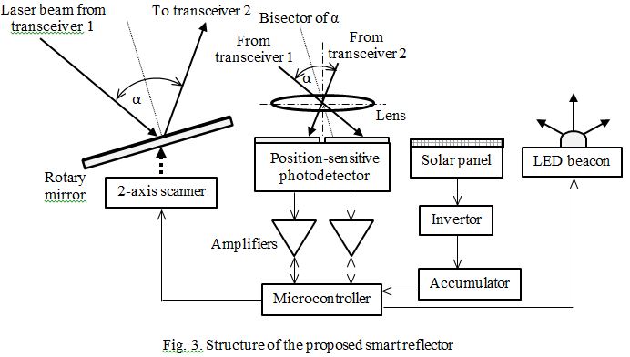 Енергію оптичного сигналу, надісланого трансивером, можна ефективніше використовувати за допомогою смарт-рефлектора. Смарт-рефлектор запропоновано зробити у вигляді керованого дзеркала, яке на основі інформації про просторове положення трансиверів автоматично встановлюється під таким кутом, щоб лазерний промінь одного трансивера відбивався в бік іншого трансивера. Кутове положення трансиверів відносно дзеркала визначається за допомогою двокоординатного позиційно-чутливого фотоприймача та лінзи перед ним. В залежності від кута падіння лазерного променя на лінзу змінюється положення сфокусованої лазерної плями на фотоприймачі, а з ним і відповідні фотоелектричні сигнали. Ці сигнали використовуються мікроконтролером для керування нахилом дзеркала за допомогою двоосьового сканера.